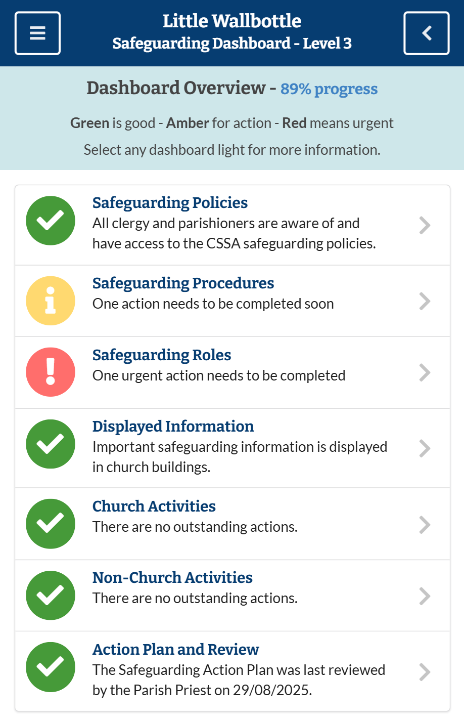 Authorised users can see the status of safeguarding at a glance. Green lights bring reassurance that all is well, amber means that action is needed, and red means it’s urgent.